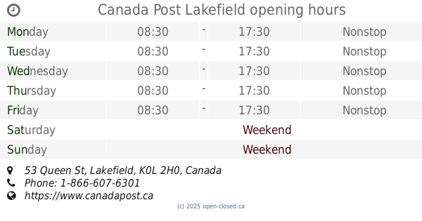 It is also possible to : Edit these OPENING HOURS of Branch Canada Post In Lakefield, 53 Queen St,